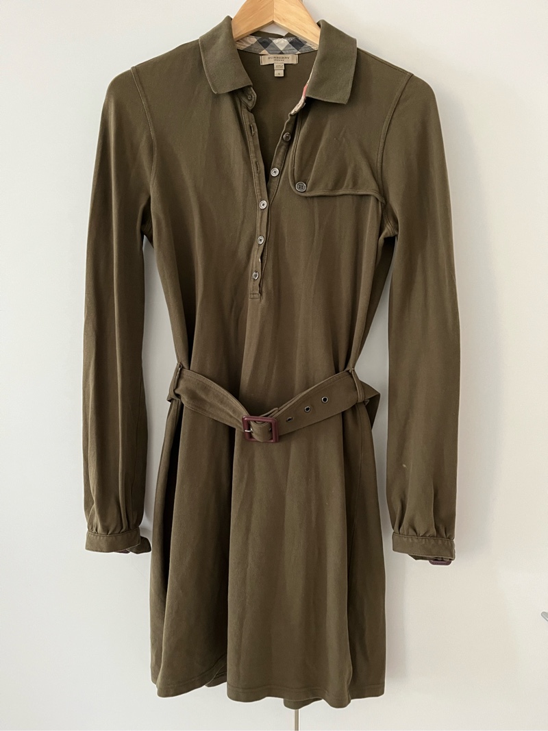 Pitkähihainen Burberryn paitamekko vyöllä ja solki/nappi yksityiskohdilla koossa S. Ei mitenkään slimmi malli eli voi mennä hyvin myös M kokoiselle. Väri näkyy parhaiten viimeisessä kuvassa. Hyvin siistissä kunnossa soljet mukaan lukien. En löydä moitittavaa vaikka on tätä käytettykin