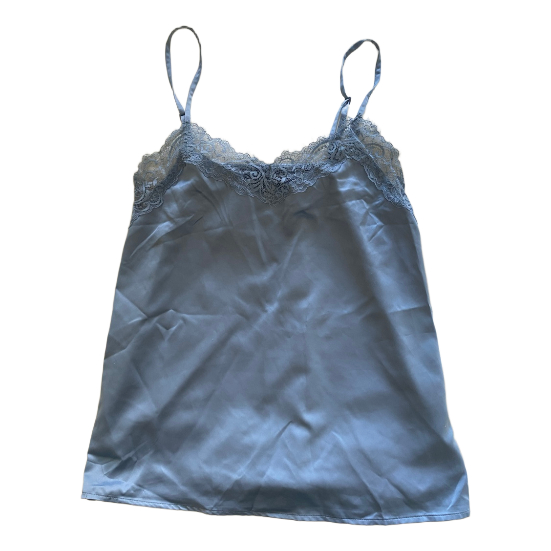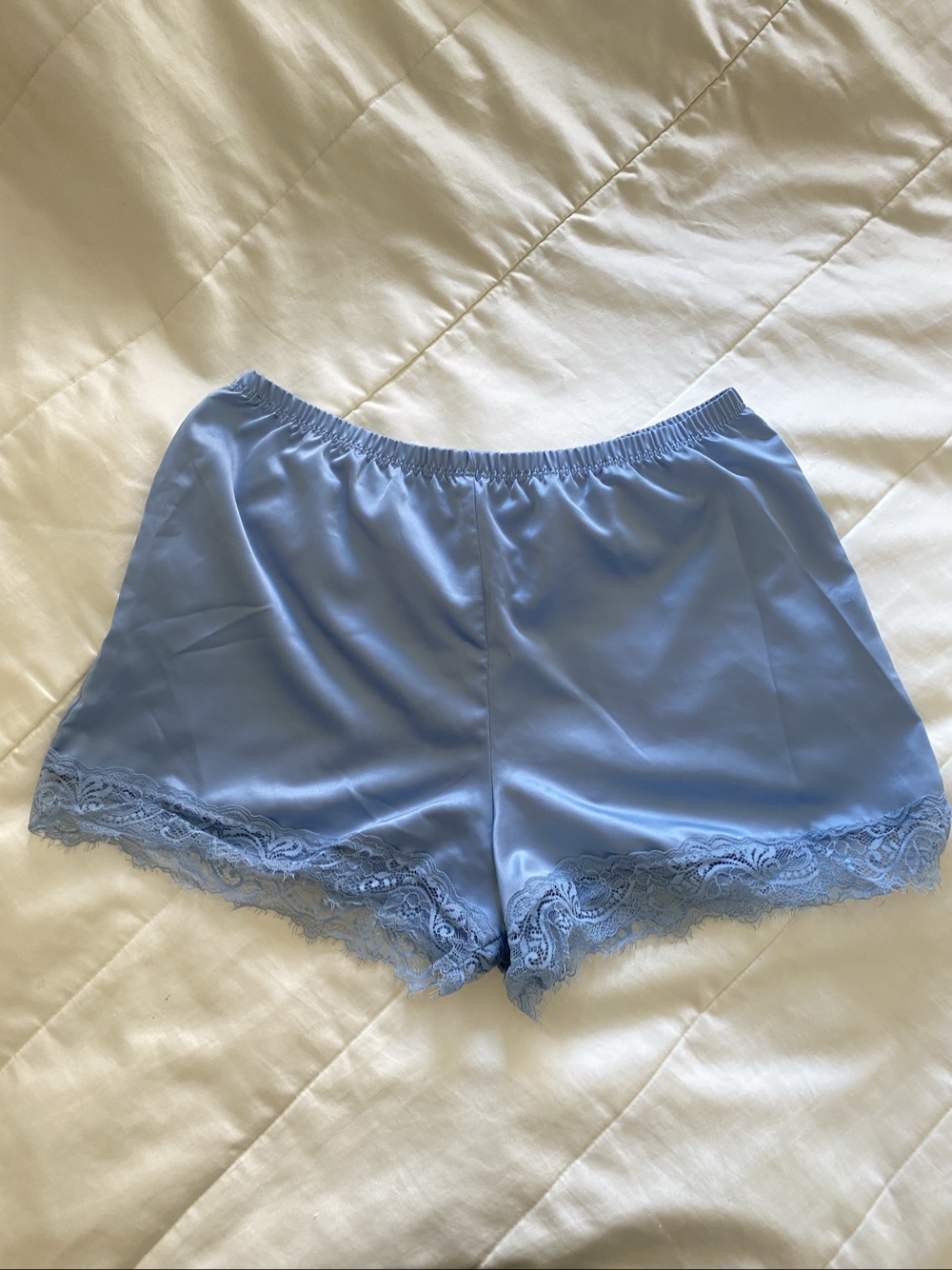 Vaaleansininen satiininen yöasu, johon kuuluu toppi ja shortsit. Molemmissa on pitsireunus. Molemmat kokoa S, käyttämättömät, laput vain leikattu pois