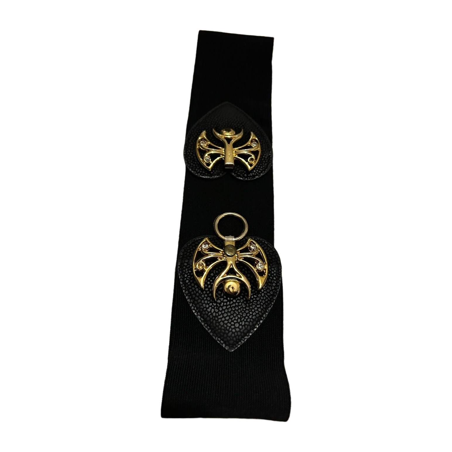 Joustava musta vyötärövyö metallisella soljella. Kullanvärinen solki strassi upotukset. Kiinnitys hakasella. Joustaa muttei superisti.