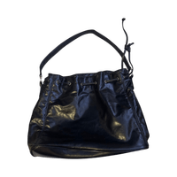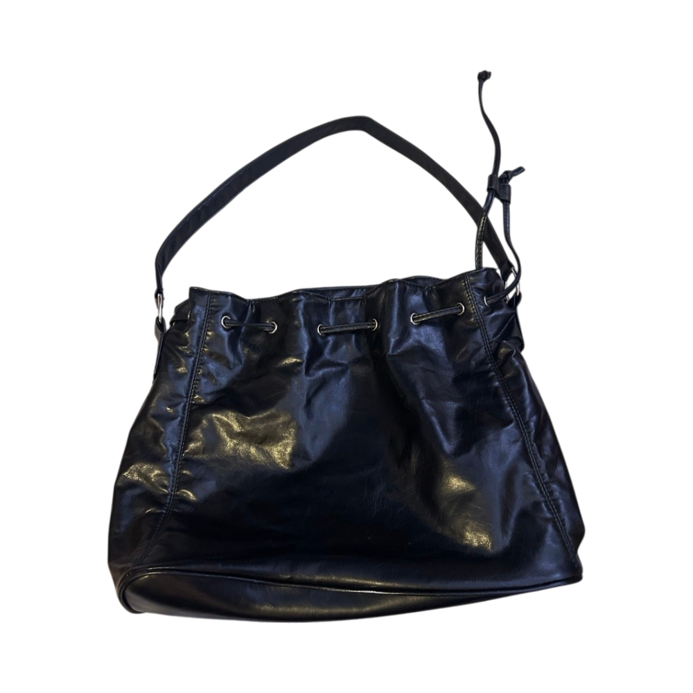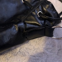 Tilava musta hihnallinen olkalaukku, vetokoristeilla.