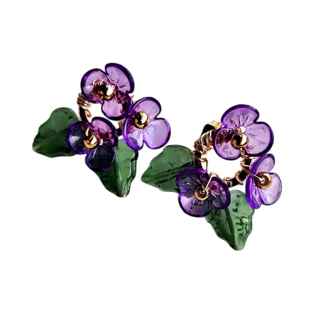 Käsintehdyt uniikit korvakorut. Söpöt violetit kukkakorvikset. Kiinnitysosat kullattua terästä. Korujen halkaisija noin 2,5 cm. #handmade #earrings #flowers #summer #cute