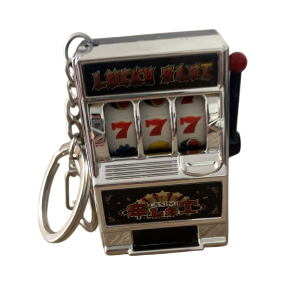 Mini kolikkopeliautomaatti-avaimenperä, toimiva vipu ja kiekot.