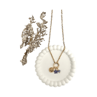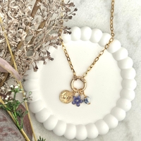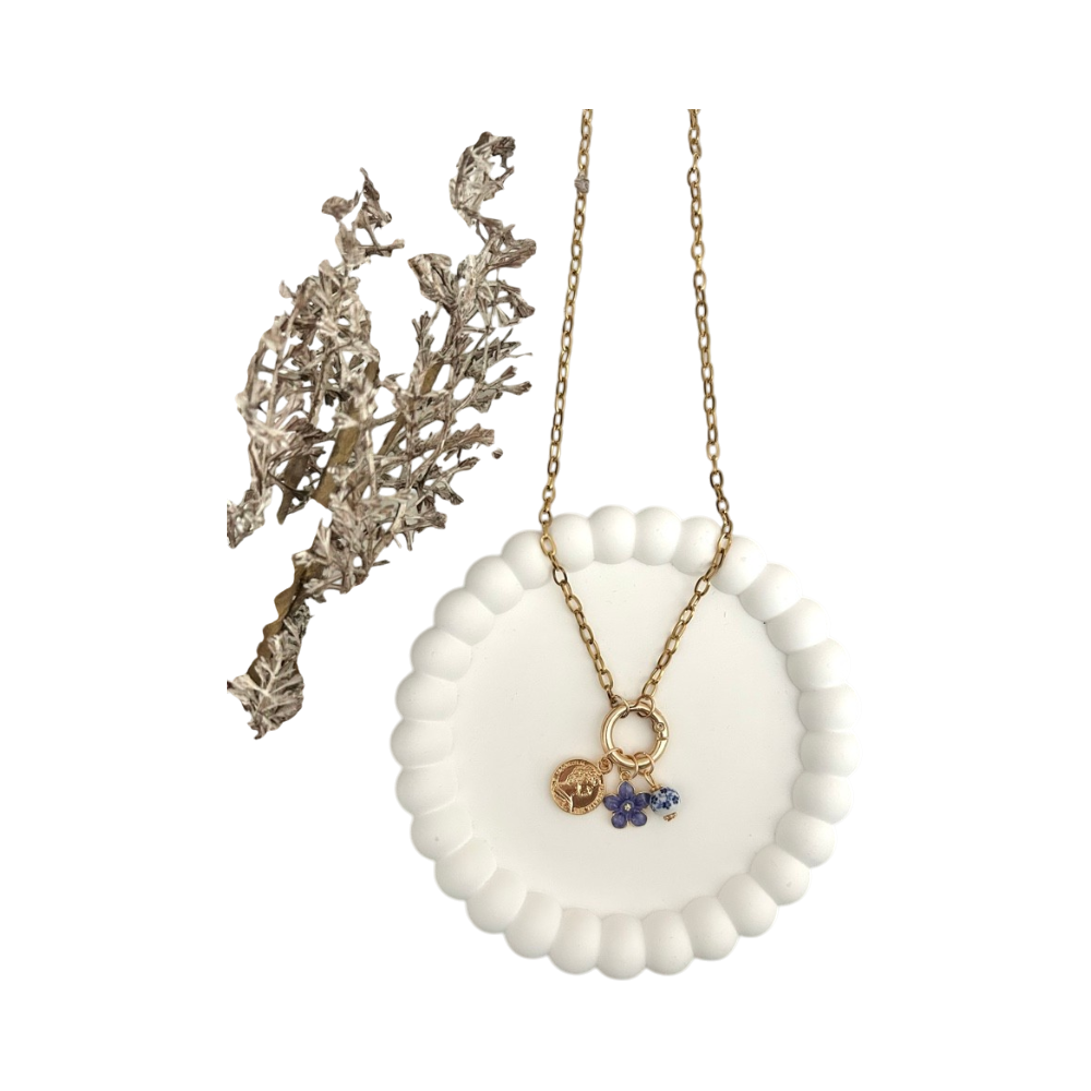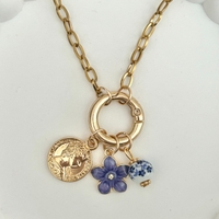 Kultaketju, kolmi-riipus: kolikko, sininen kukka, helmi.