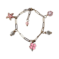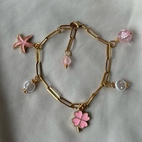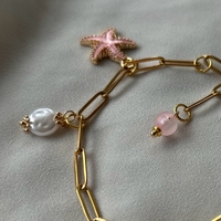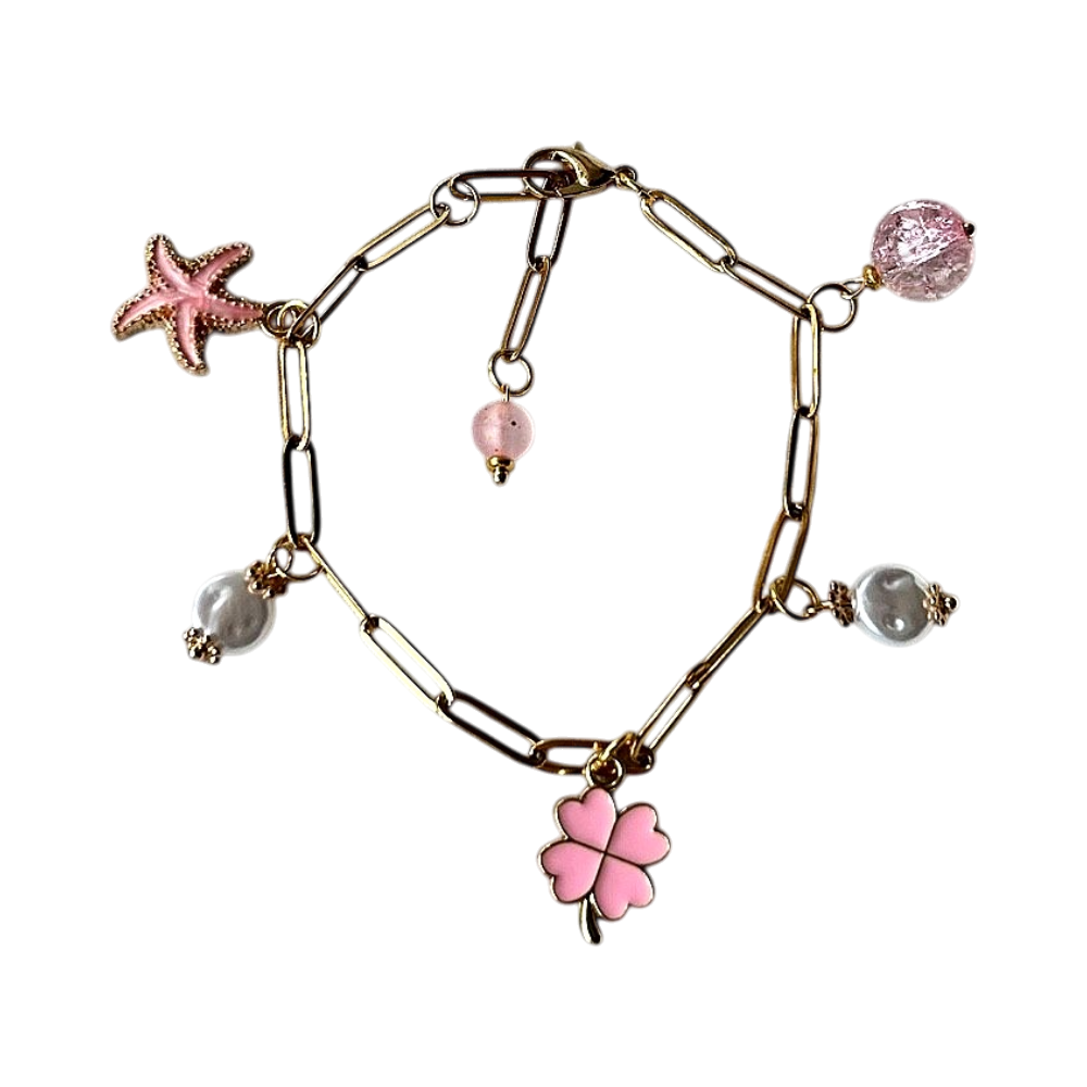 Kultainen rannekoru, jossa vaaleanpunaiset ja valkoiset riipukset. Käsintehty