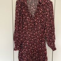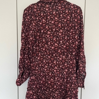 Tummasävyinen kukkakuvioitu minimekko, jossa punaisia, vaaleanpunaisia ja lilan sävyisiä kukkia. Napakampi kangas, kietaisuleikkaus, pitkät hihat ja kaulusyksityiskohta. Osa Paris Atelier -mallistoa.