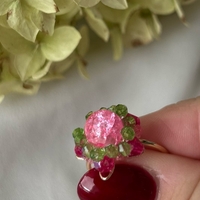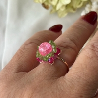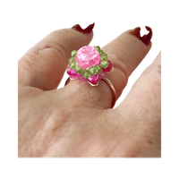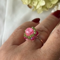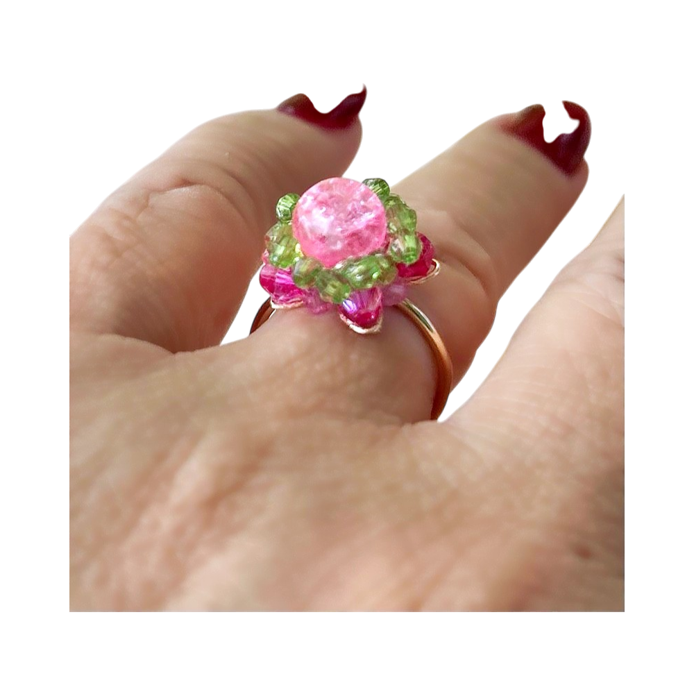Koristeltu sormus pinkeillä ja vihreillä helmillä. Käsintehty. Koko 17mm