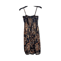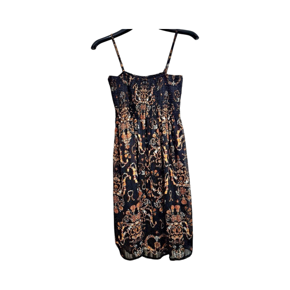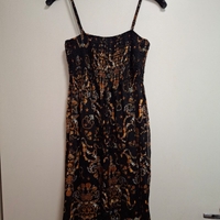 Kevyt hihaton mekko, musta pohja oransseilla kuvioilla. Vastaa mielestäni s-m kokoaan