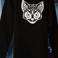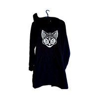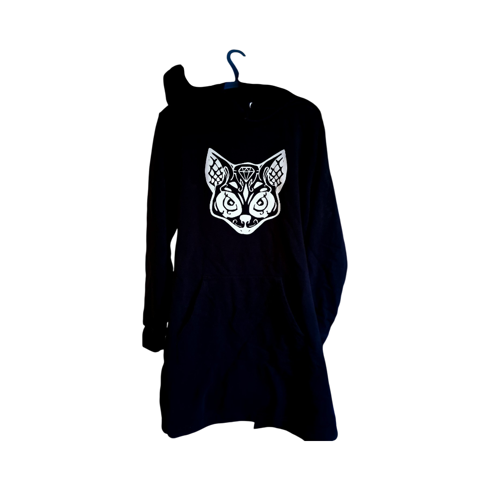 Pitkä musta hupparimekko, edessä näyttävä valkoinen kissa-kuvio.