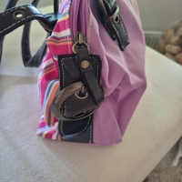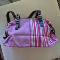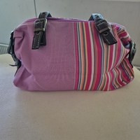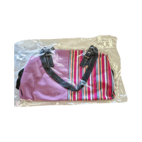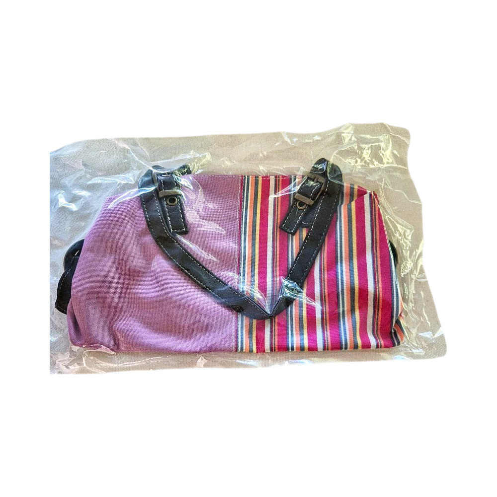 Värikäs olkalaukku, jossa raidallinen ja vaaleanpunainen kangas.eli juuri avattu paketista