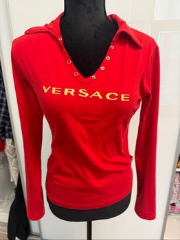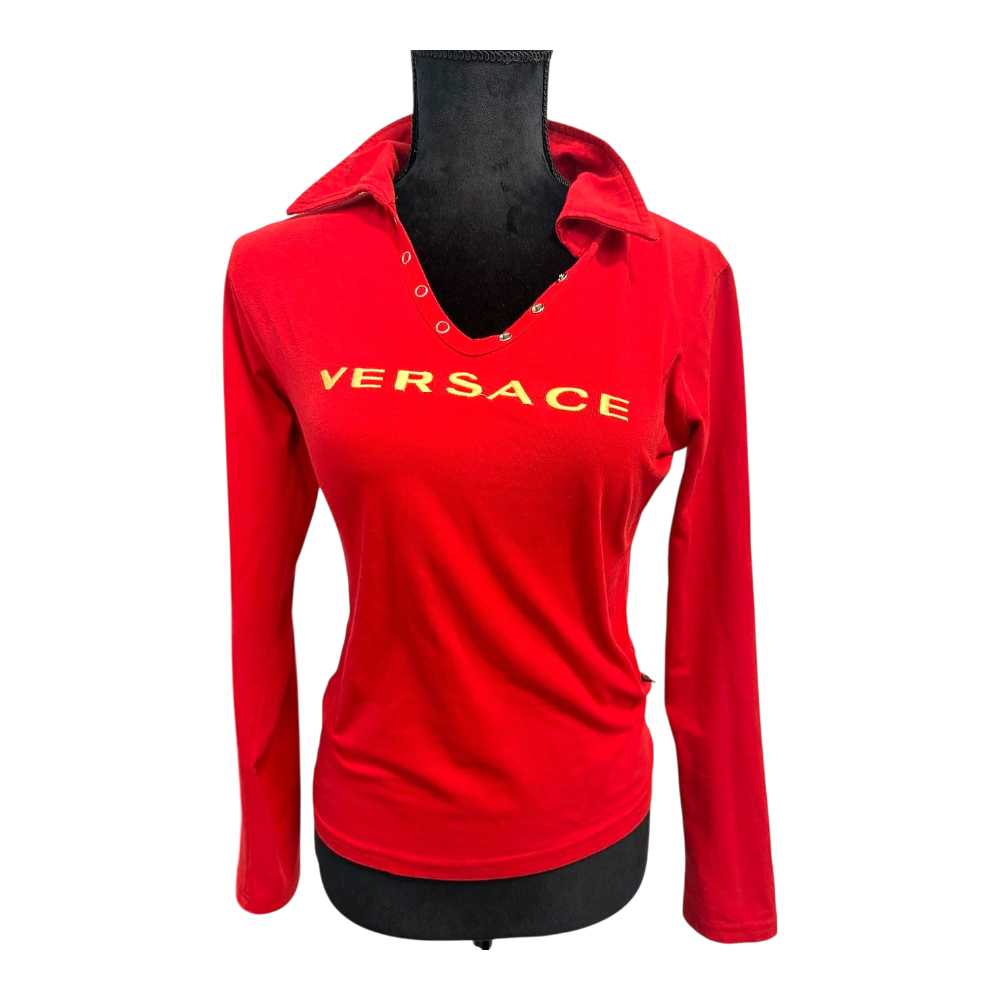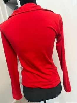 Red long-sleeved top with a collar and snap-button placket detail. Features the brand name printed on the chest.