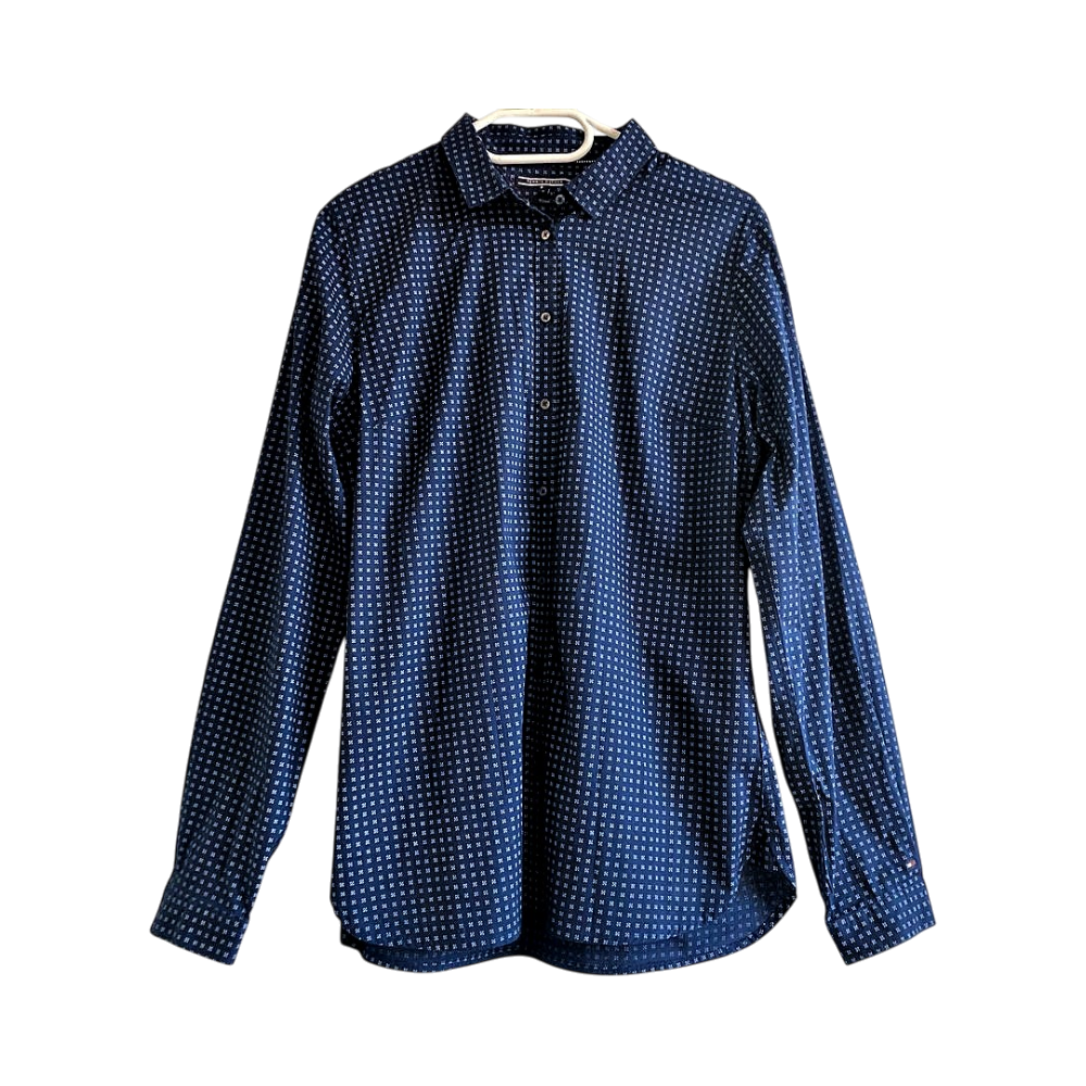 Tommy Hilfiger, button-down shirt, fitted shirt, women’s shirt, navy blouse, navy shirt, white micro print, smart casual, elegant, office wear, business casual, minimalist, preppy, clean aesthetic, American classic, timeless, capsule wardrobe, quality cotton, coastal chic, luxury feel, effortless style, classic women’s shirt, premium brand