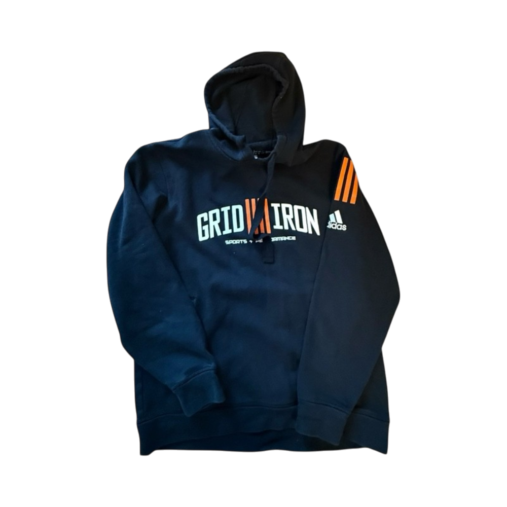 Musta adidas-huppari GRIDIRON-printillä, hyväkuntoinen.