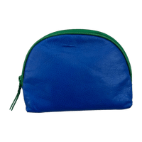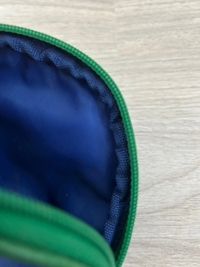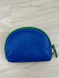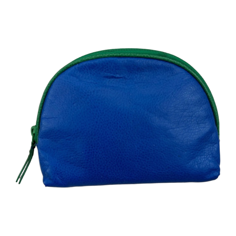 Käytetty, hyvässä kunnossa, sininen nahkainen pussi.