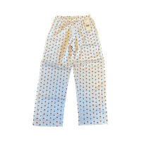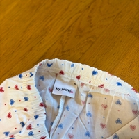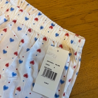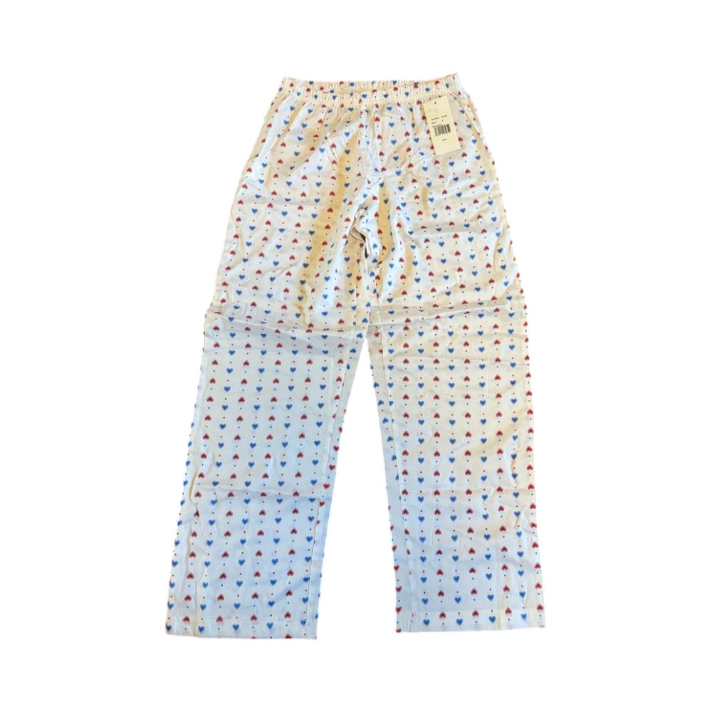 käyttämättömät, kevyet housut, joissa hauska punasininen kuviointi valkoisella pohjalla.