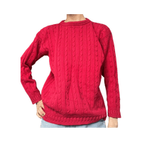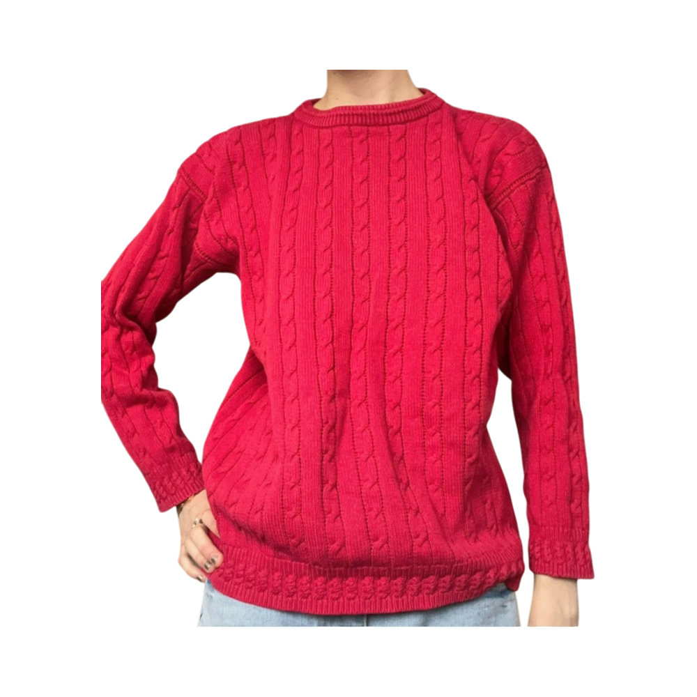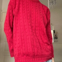 Bright pink/red cable-knit long-sleeve pullover, relaxed fit.