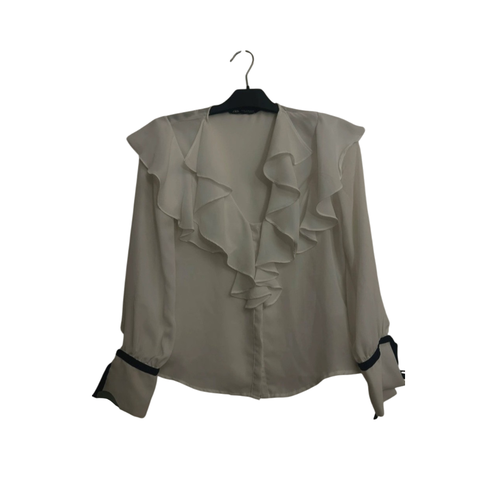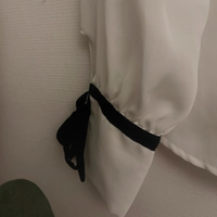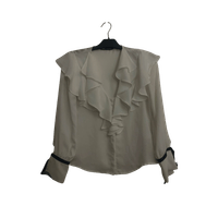 Valkoinen röyhelöpusero mustilla yksityiskohdilla.