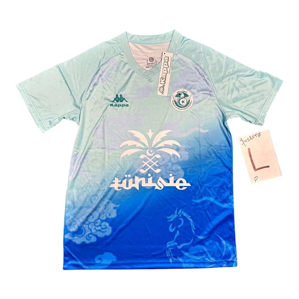 Light blue to blue gradient short-sleeved t-shirt with a V-neck. Features a palm tree graphic and 'tunisie' text on the front.