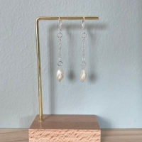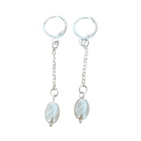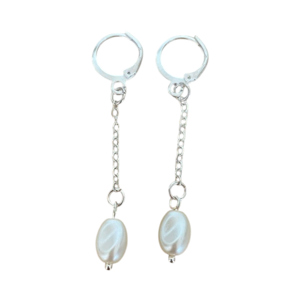 Käsintehdyt pitkät hopeanväriset ketjukorvakorut valkoisilla tekohelmillä🤍