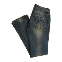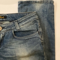 Muutaman kerran käytetyt farkut vuodelta 2006. Matalavyötäröiset ja leveälahkeiset.