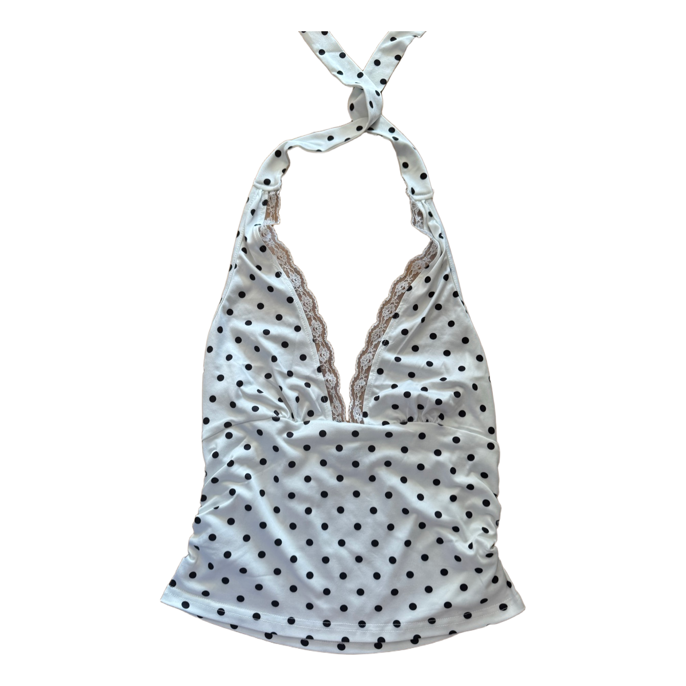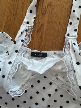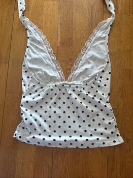 Valkoinen pilkkukuvioinen toppi, jossa pitsireunus ja solmittava kaula-aukko. Koko XS.
