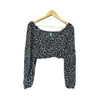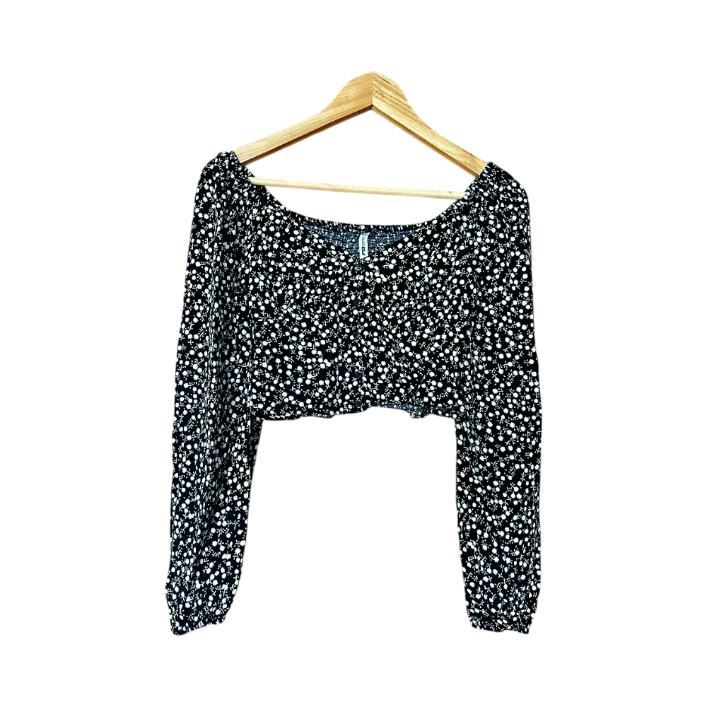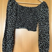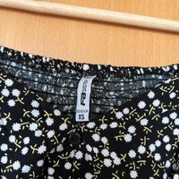 Musta crop-paita valkoisilla kukkakuvioilla, koko XS. Imarteleva muotoilu, keskivartalon joustava rypytys takaa istuvuuden kaikille vartaloille. Uudenveroisessa kunnossa