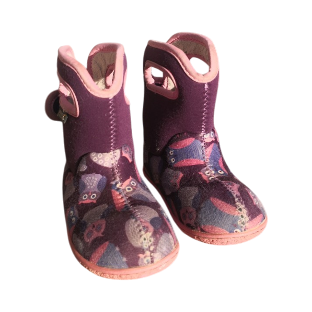 Lasten lämpimät paljasjalkasaappaat, sisällä keinoturkisvuori. Koko 23. Pöllökuosi. Jonkin verran kulumaa pohjissa kantapään päässä.