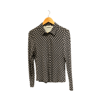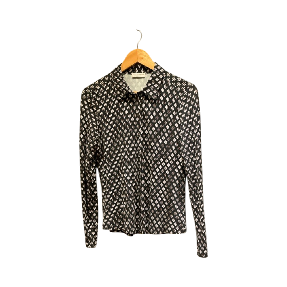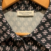 Muutaman kerran käytetty erinomaisessa kunnossa Marc O'Polo pitkähihainen kauluspaita naisille, koko S. Joustava materiaali, vastaa kokoa. Tummansinisellä pohjalla valkoinen-pinkki-vaaleanpunainen kuviointi, väri näkyy parhaiten lähikuvassa.