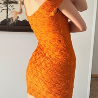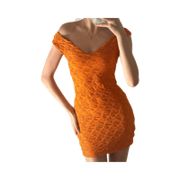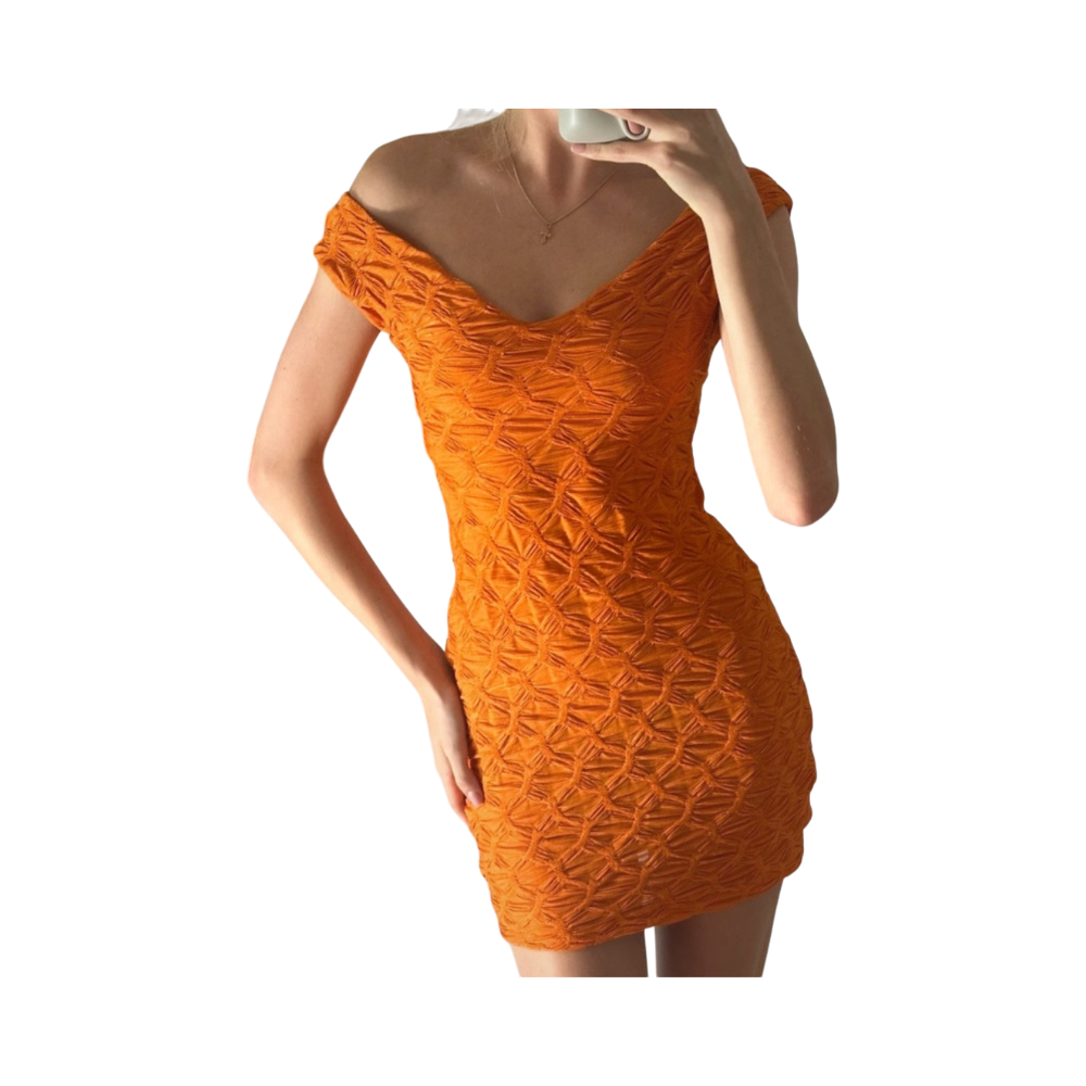 Fitted off-shoulder mini dress with textured geometric pattern.