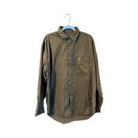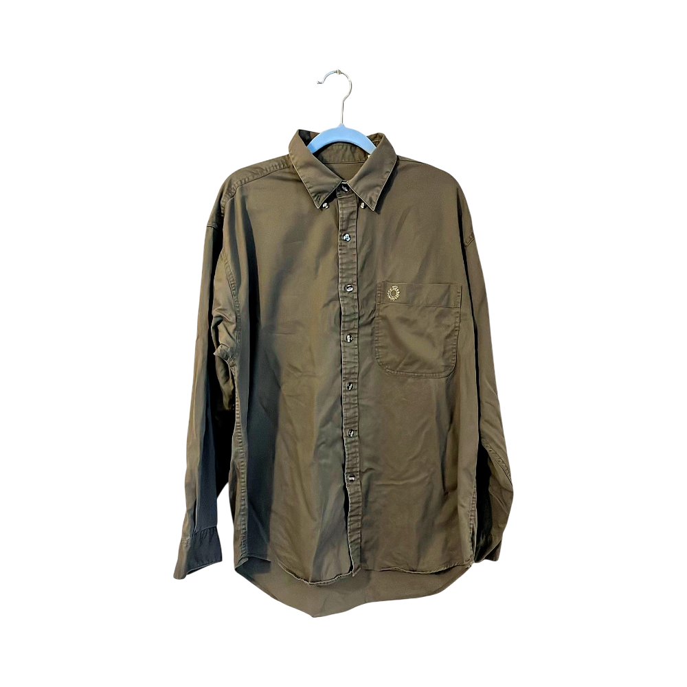 Vihreä kauluspaita, lapussa lukee M, mutta on reilua kokoa.