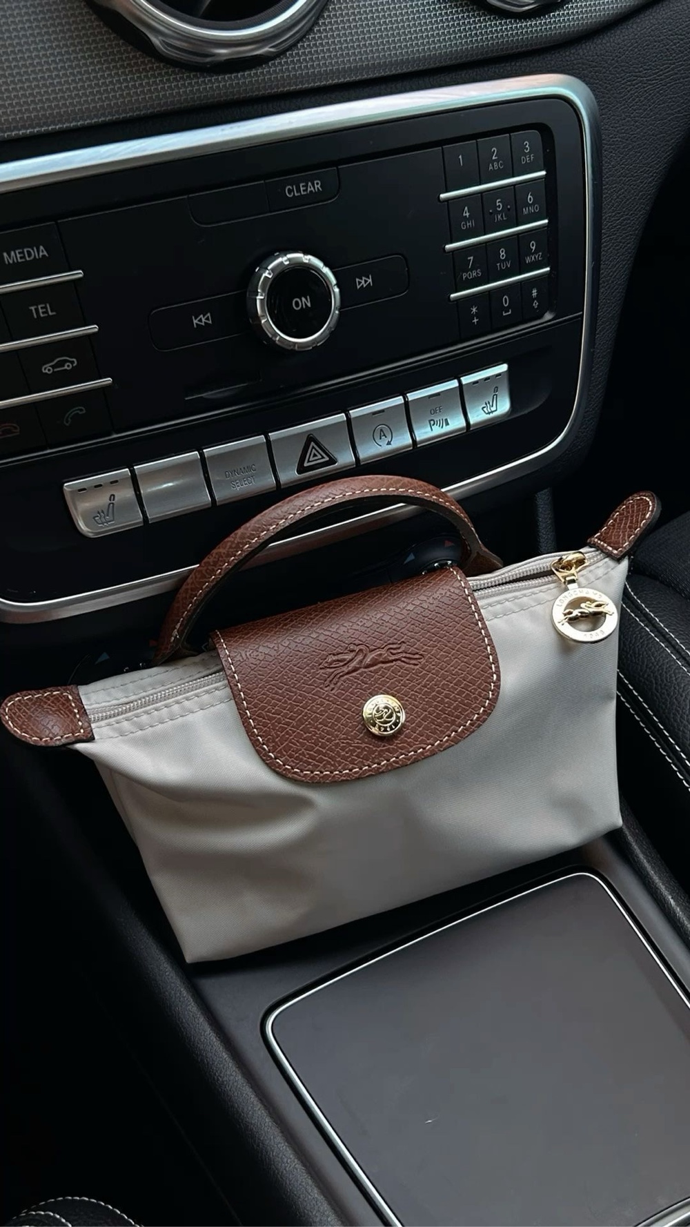 Pieni Longchamp-pussukka. Beige kangas ruskeilla nahkayksityiskohdilla. Vetoketjukiinnitys ja painonappi.