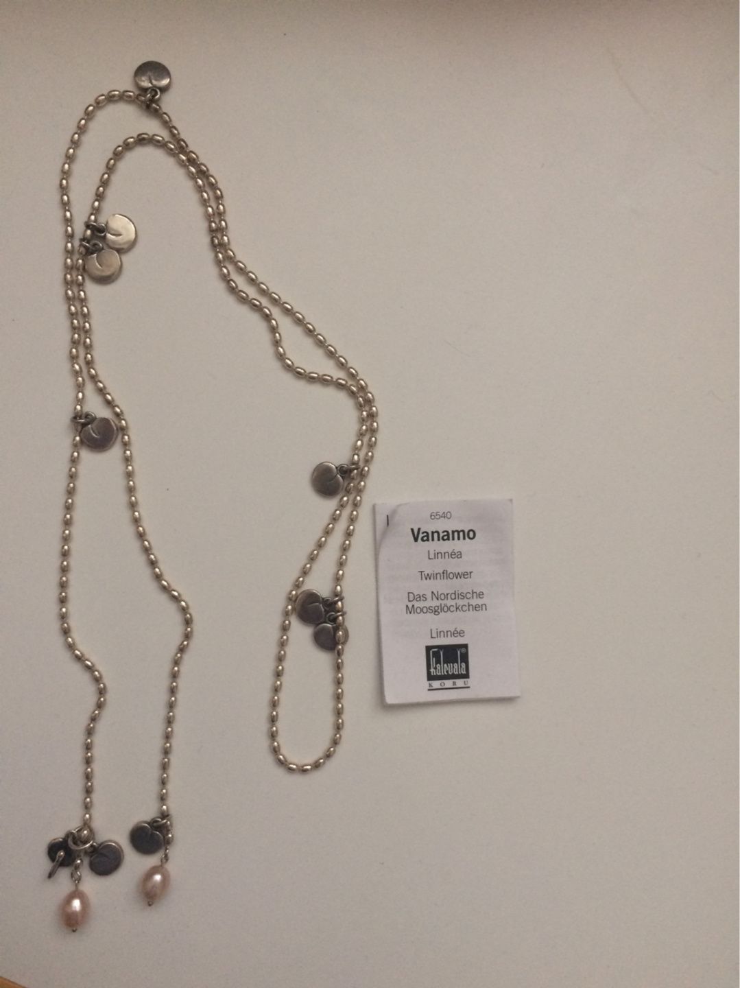 Kalevala Korun Vanamo- kääty vaaleanpunaisilla helmillä. Pituus 80 cm. Jäänyt laatikon pohjalle itsellä.