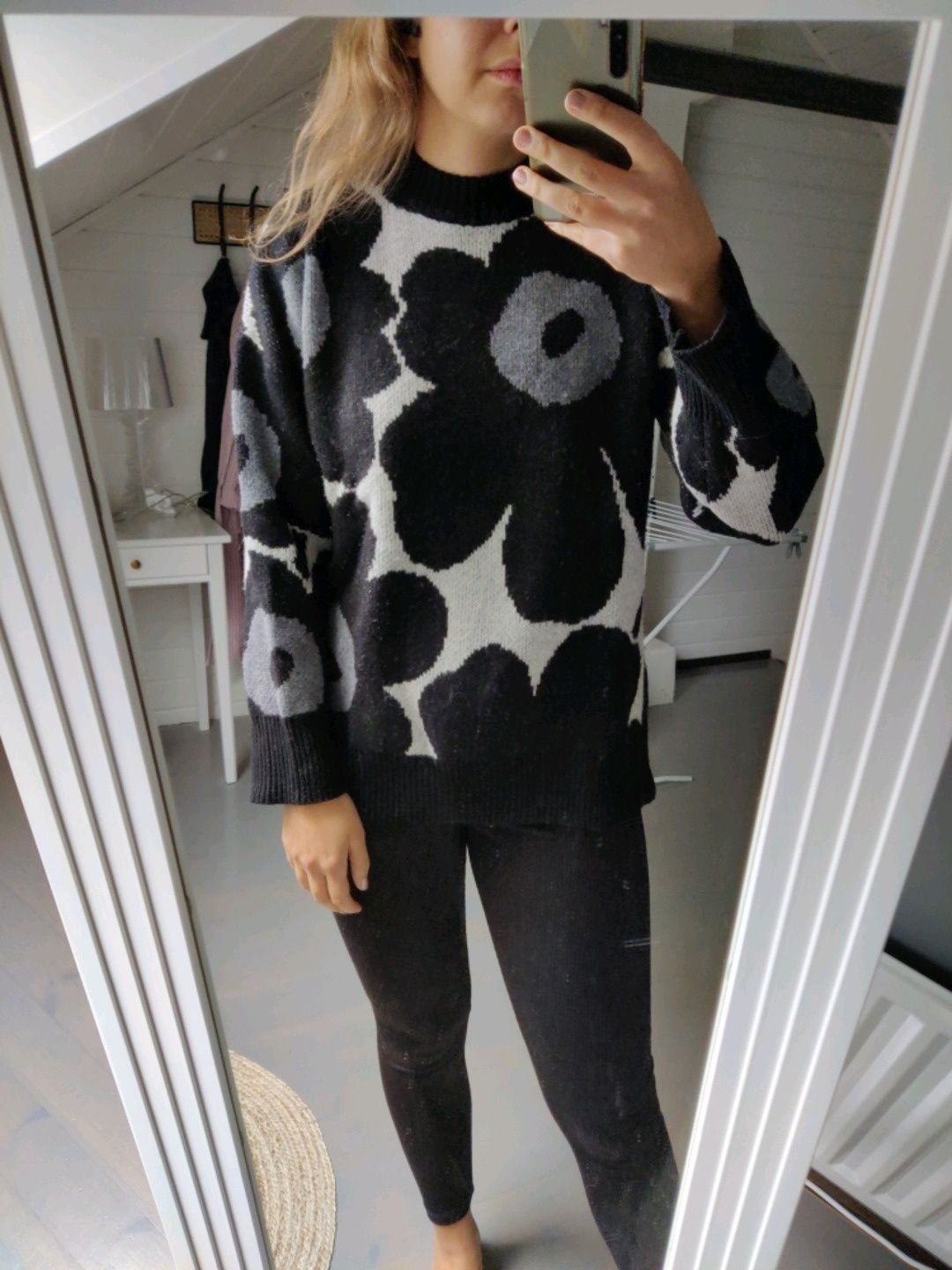 Marimekko Onnekas Unikko -neule, mustavalkoinen. Koko XS, mutta sopii myös S-M kokoisellekin. Sivussa korkeat halkiot.