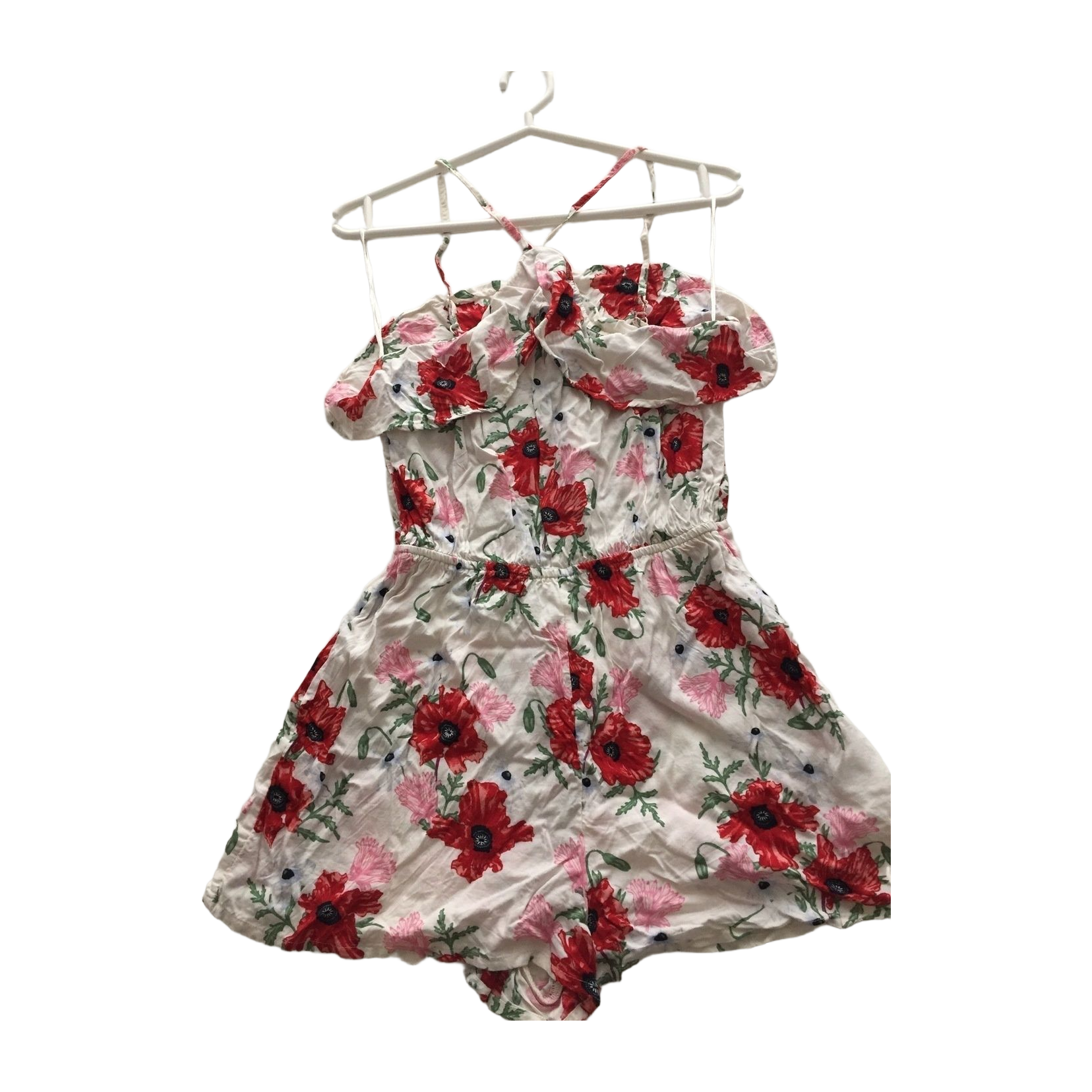 Kesäinen kukkahaalari koossa 38. Toinen olkain irronnut ompeleistaan enkä ole jaksanut korjata, näkyy kuvissa tehty solmu. Pesulaput leikattu irti, materiaalista ei varmuutta.