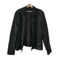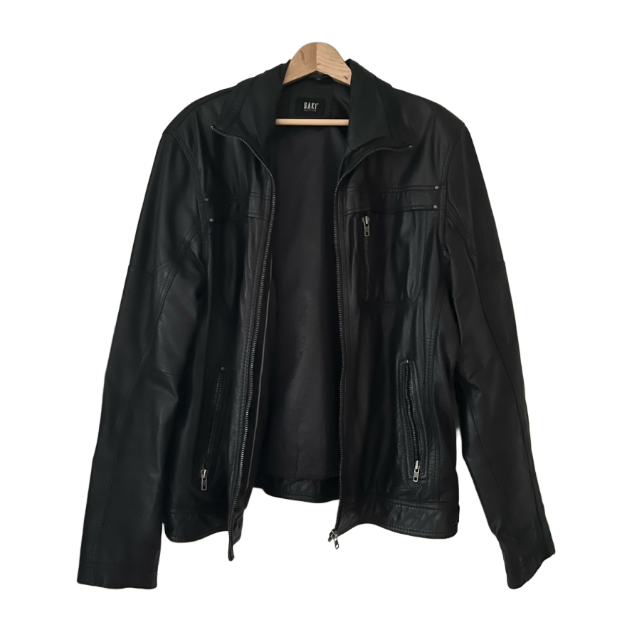 Musta nahkatakki, koko 54. 100% nahkaa, sisävuori 100% polyesteriä.