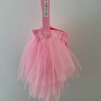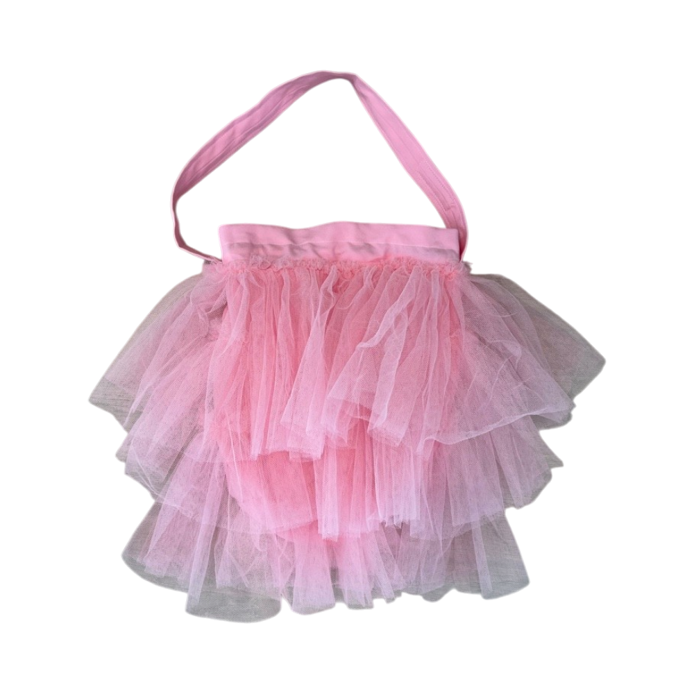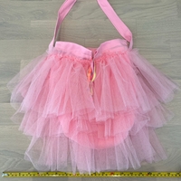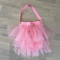 Uusi käyttämätön pinkki röyhelö laukku. Kassissa on kiristysnauhat. Mitat näkyvät kuvissa.