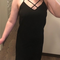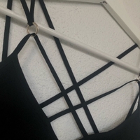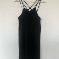 Musta juhlamekko naruolkaimilla, joissa koristeena kultaiset renkaat. Sivusaumoissa pienet, muutaman sentin halkiot. Pituus hieman polven yläpuolelle. Kangas ohutta, mutta ei läpikuultavaa tai rypistyvää materiaalia. Tuotelaput leikattu pois, joten materiaalista ei tietoa; luultavasti polyesteriä. Tästä kaunis pikkumusta kevään juhliin!