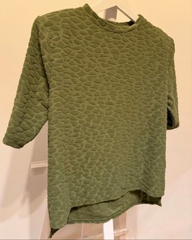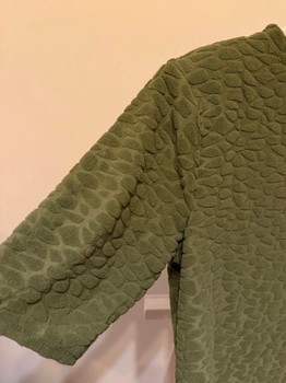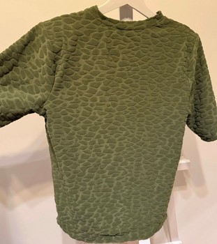 Textured short-sleeved top in olive green. Features a rounded neckline and a slightly raised animal-like pattern.