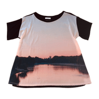 Paul Smith hienostuneen keveä paita merkittyä kokoa XS. Mitoitus on rento, paita menee hienosti myös S-kokoiselle. A-linjainen, levenee helmaa kohti. Etuosaa koristaa kaunis maisema, takaosa ja hihat ovat kokonaan mustat. Etuosan materiaali on 98% polyesteriä ja 2% elastaania, takaosa on 100% modaalia, laskeutuu todella kauniisti. Uusi.