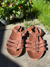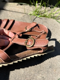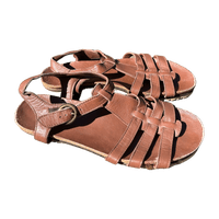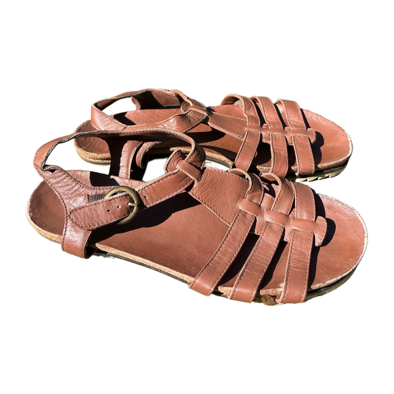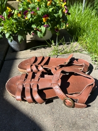 Ruskeat nahkasandaalit, säädettävä solki, käytetyt.