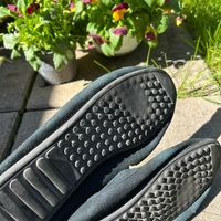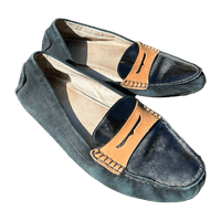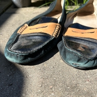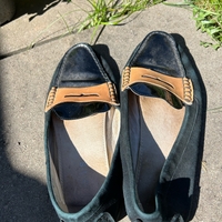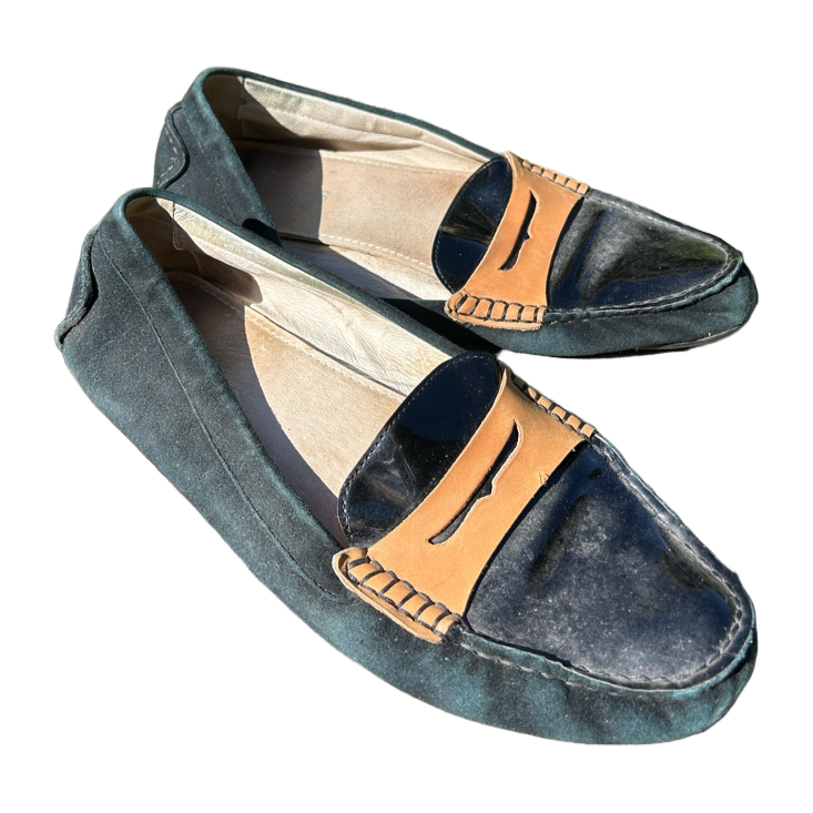 Käytetyt vihreät ja ruskeat mokkanahkaiset loafersit.