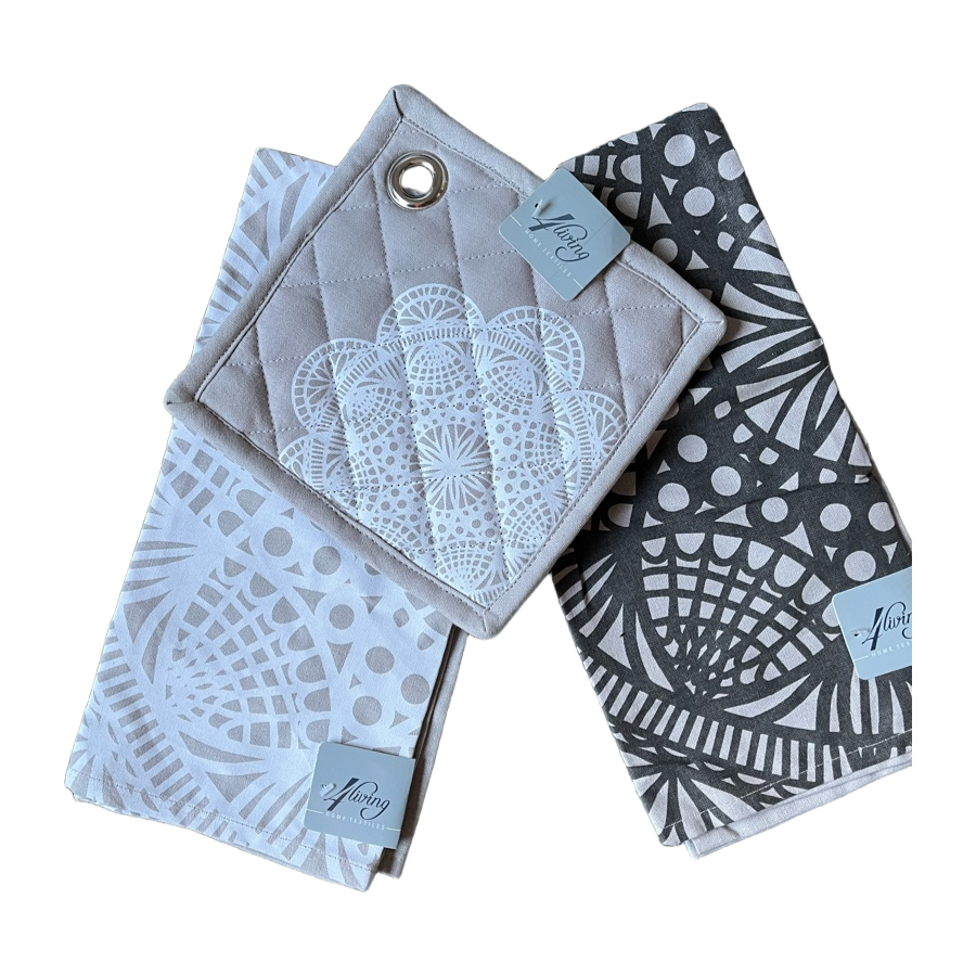 Kuviolliset keittiöpyyhkeet ja patalappu, uudet