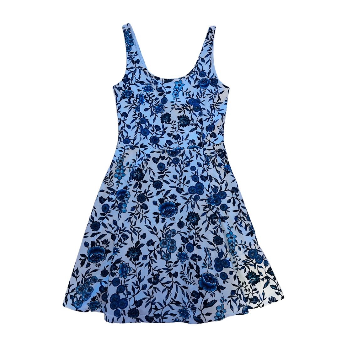 Valkoinen mekko sinisellä kukkakuviolla, hihaton malli.