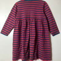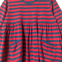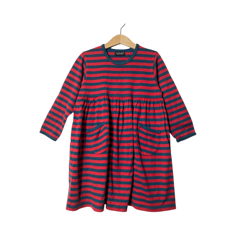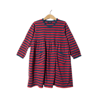 Marimekko sini-punaraidallinen pitkähihainen mekko.