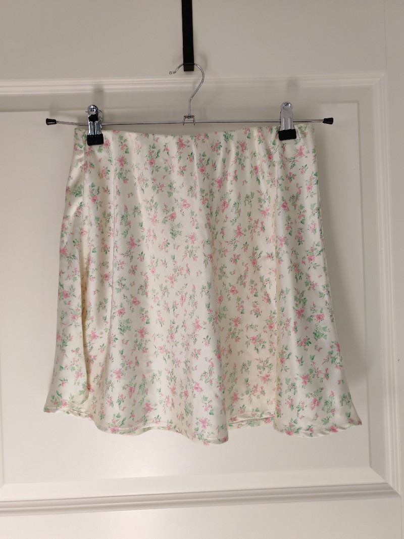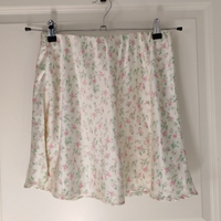 kukkakuvioinen satiinihame, kevyt ja naisellinen malli. Kuminauha vyötärö. Pari kertaa käytetty.
