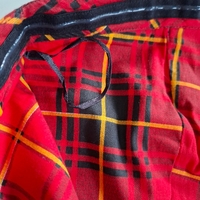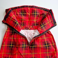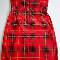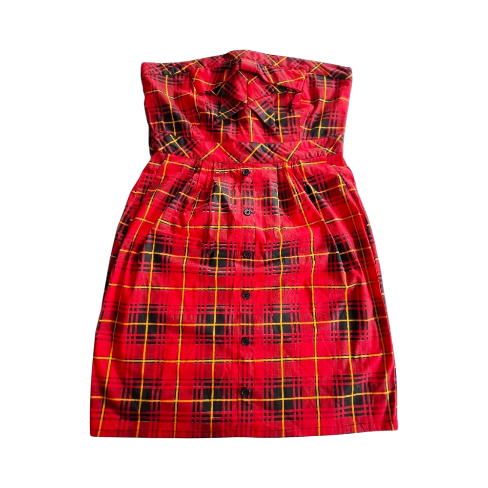 Strapless bodice and high-waist red plaid skirt with side pockets.
