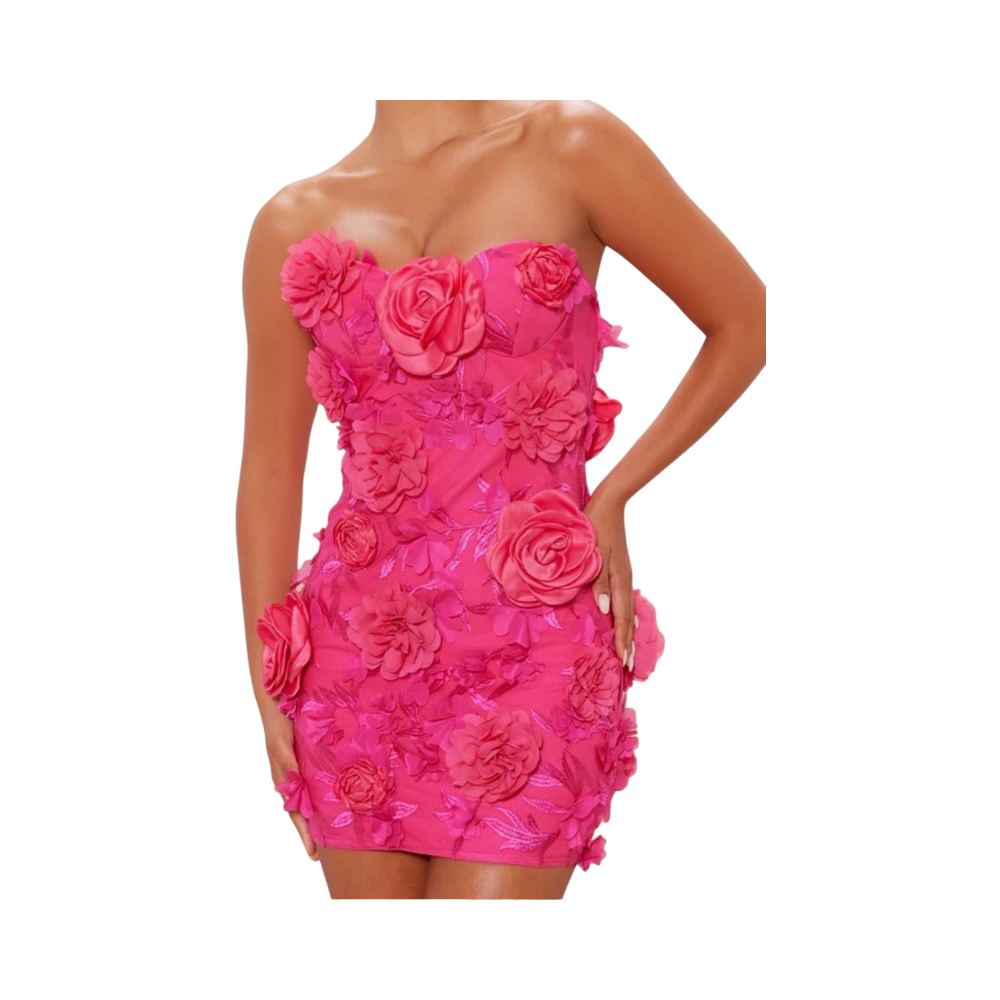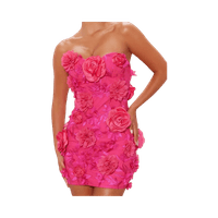 Strapless mini dress with 3D floral appliqués, fitted silhouette.