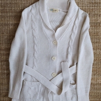 Milton merkkinen neuletakki. Kokomerkintä L. Neuleessa on taskut ja vyö. Arvioisin neuleen olevan 70-luvulta. Kainalo-kainalo 46cm. Vyötärömitta noin 86cm.