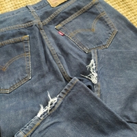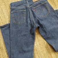 Levi's 501 farkut ysäriltä. Väri tummansininen, joka on pesussa haalistunut. Lahkeiden suut kuluneet rikki (kuva 4). Muitakin pieniä kulumia löytyy. Vyötärön ympärys 85 cm. Lahkeen sisäpituus 90cm.