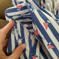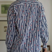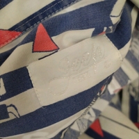 Jeep merkkinen ranskalainen, seilorikuosinen paitapusero. Kokoarvio L. Kauluksessa kulumaa ja kainalon olen paikannut näkyvin ompelein, kangaspala alla (kuva 3). Kainalo-kainalo 58cm, niska-helma 73cm, hiha kainalosta 53cm.