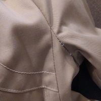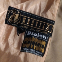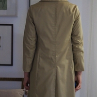 Kestilän trenssi. Koko noin 36-38. Sivuilla taskut. Takana halkio. Vuoritettu. Vasemman kainalon sauman ommel löystynyt (kuva 3). Kainalo-kainalo 48cm, niska-helma 92cm, hiha kainalosta 39cm.